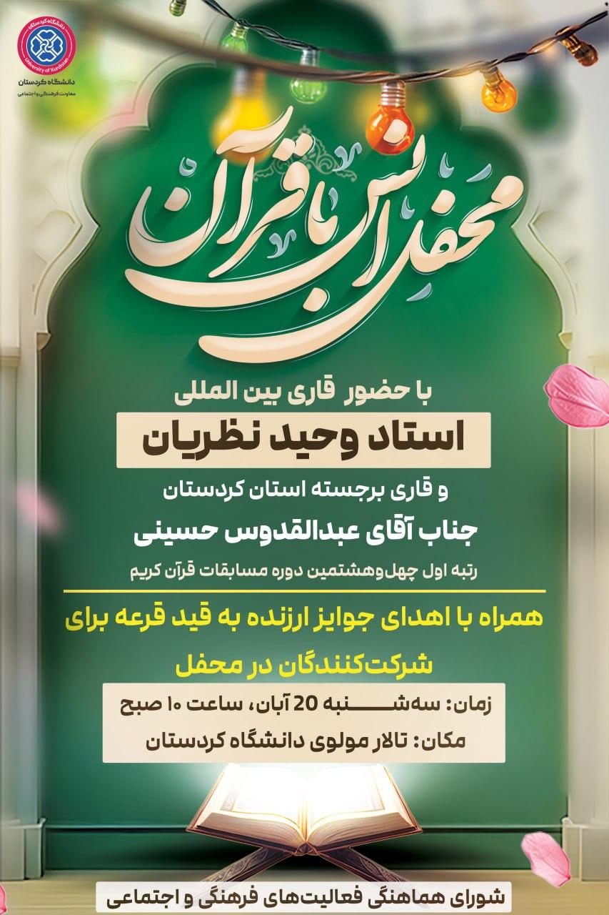 تتشرف جامعة كردستان بدعوتكم لحضور محفل قرآني مبارك، يُعقد بمشاركة قارئ دولي مرموق وقارئ بارز من محافظة كردستان.