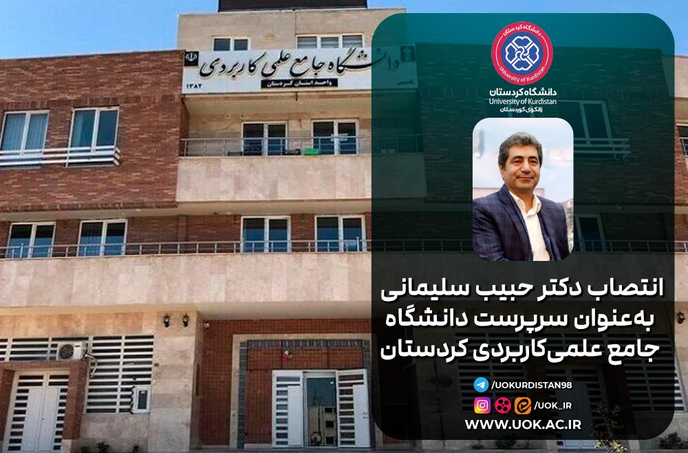 بموجب مرسوم صادر عن رئيس الجامعة الشاملة للعلوم التطبيقية في إيران، تم تعيين الدكتور حبيب سليماني، عضو هيئة التدريس بجامعة كردستان، رئيساً مكلفاً لوحدة الجامعة في محافظة كردستان.